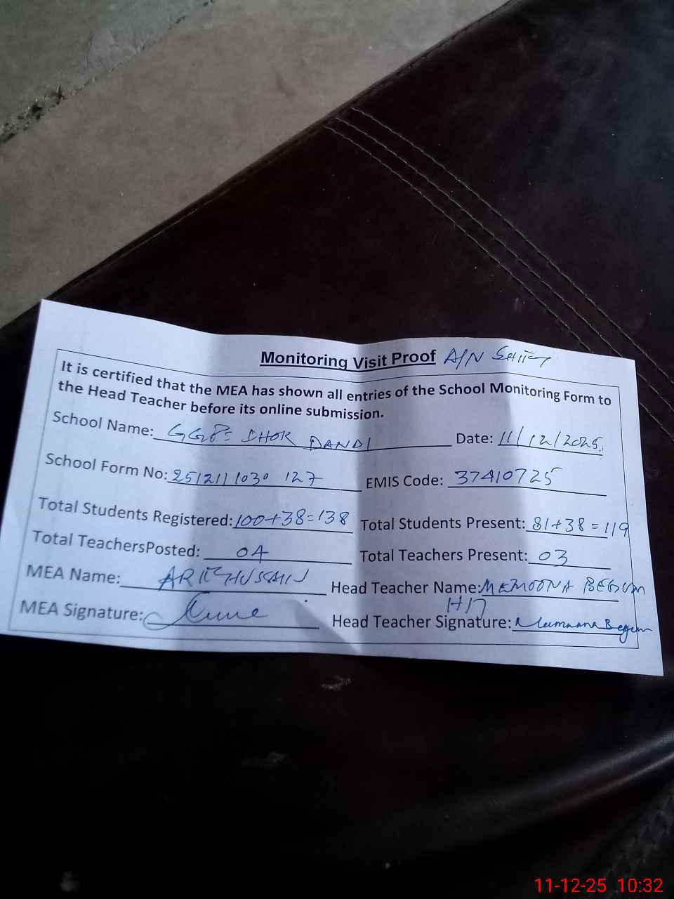 | Attendance Register | Head Teacher | MEA with School | Visit Proof |