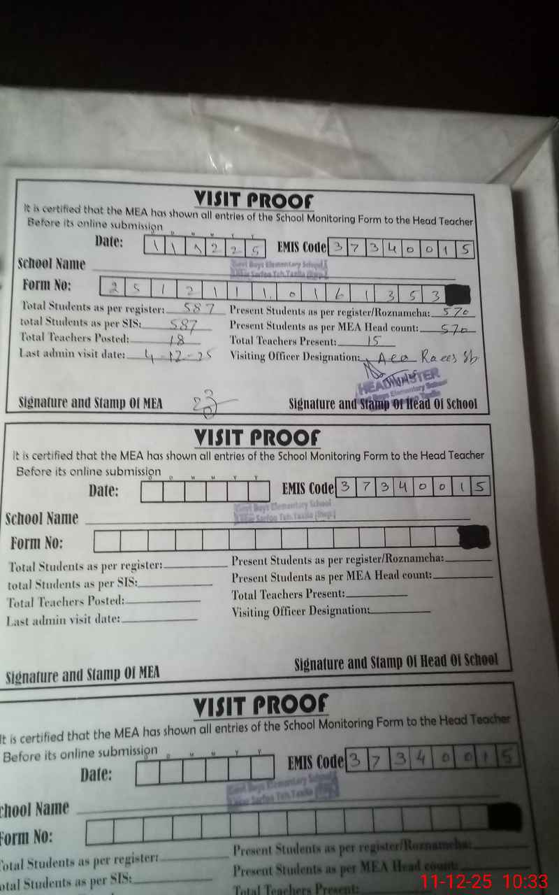 | Attendance Register | Head Teacher | MEA with School | Visit Proof |