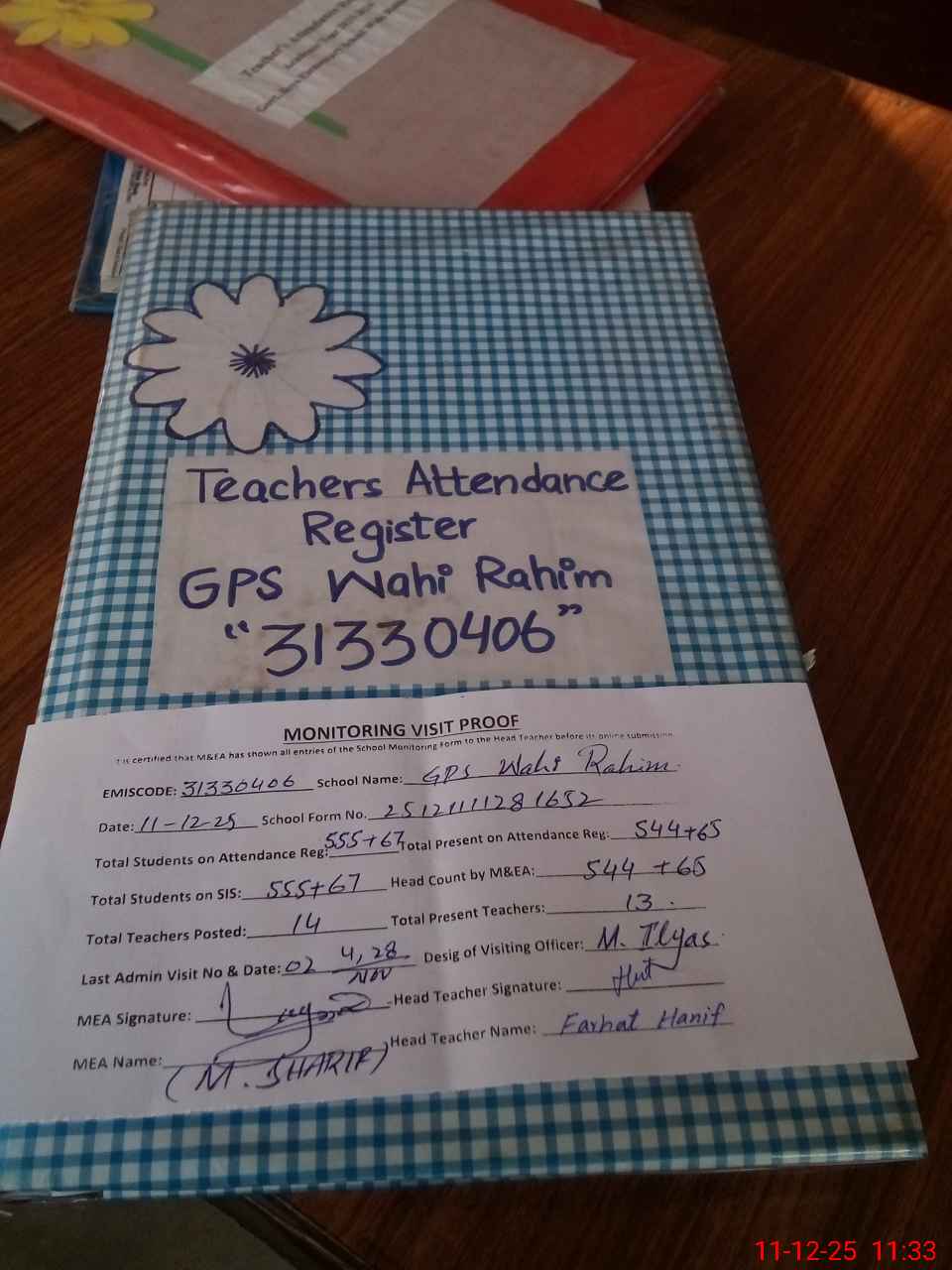 | Attendance Register | Head Teacher | MEA with School | Visit Proof |