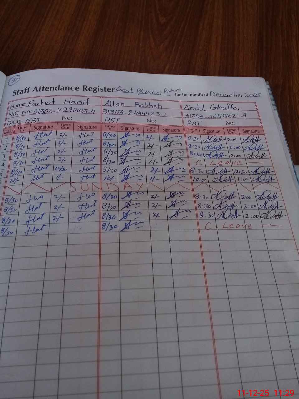 | CNIC | Full Name | Designation | R/C | Absence During Last Calender Month |