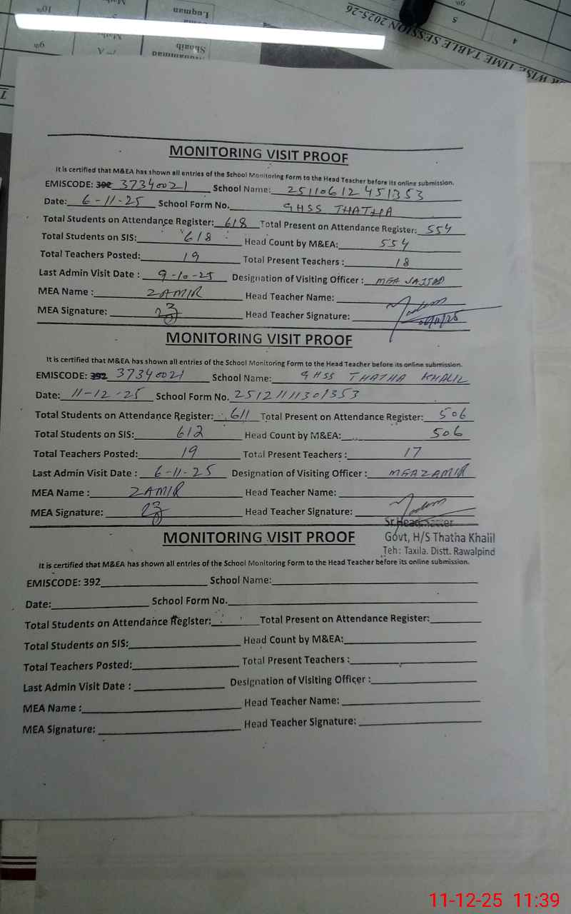 | Attendance Register | Head Teacher | MEA with School | Visit Proof |