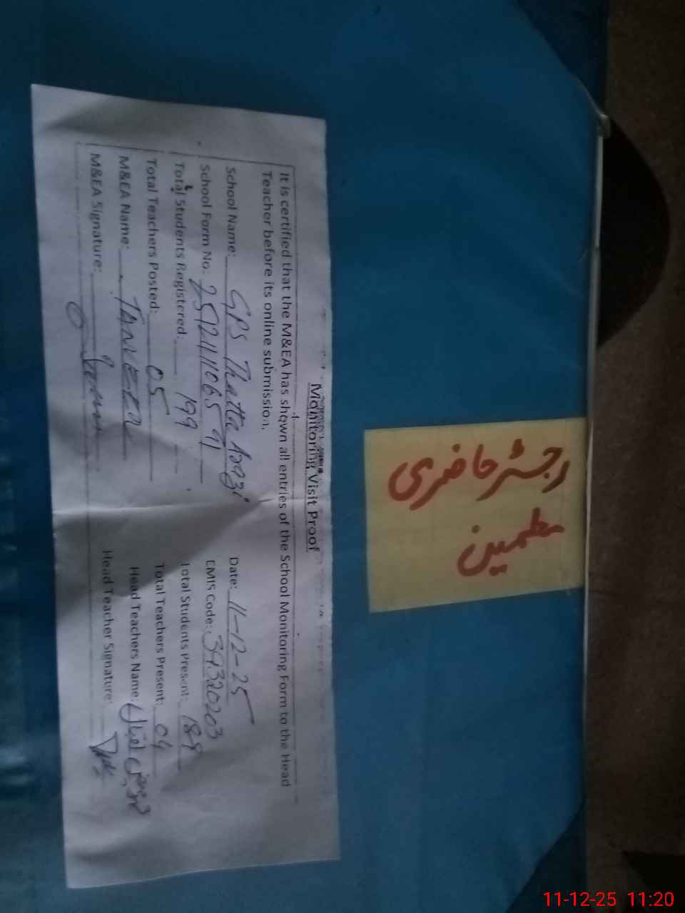 | Attendance Register | Head Teacher | MEA with School | Visit Proof |