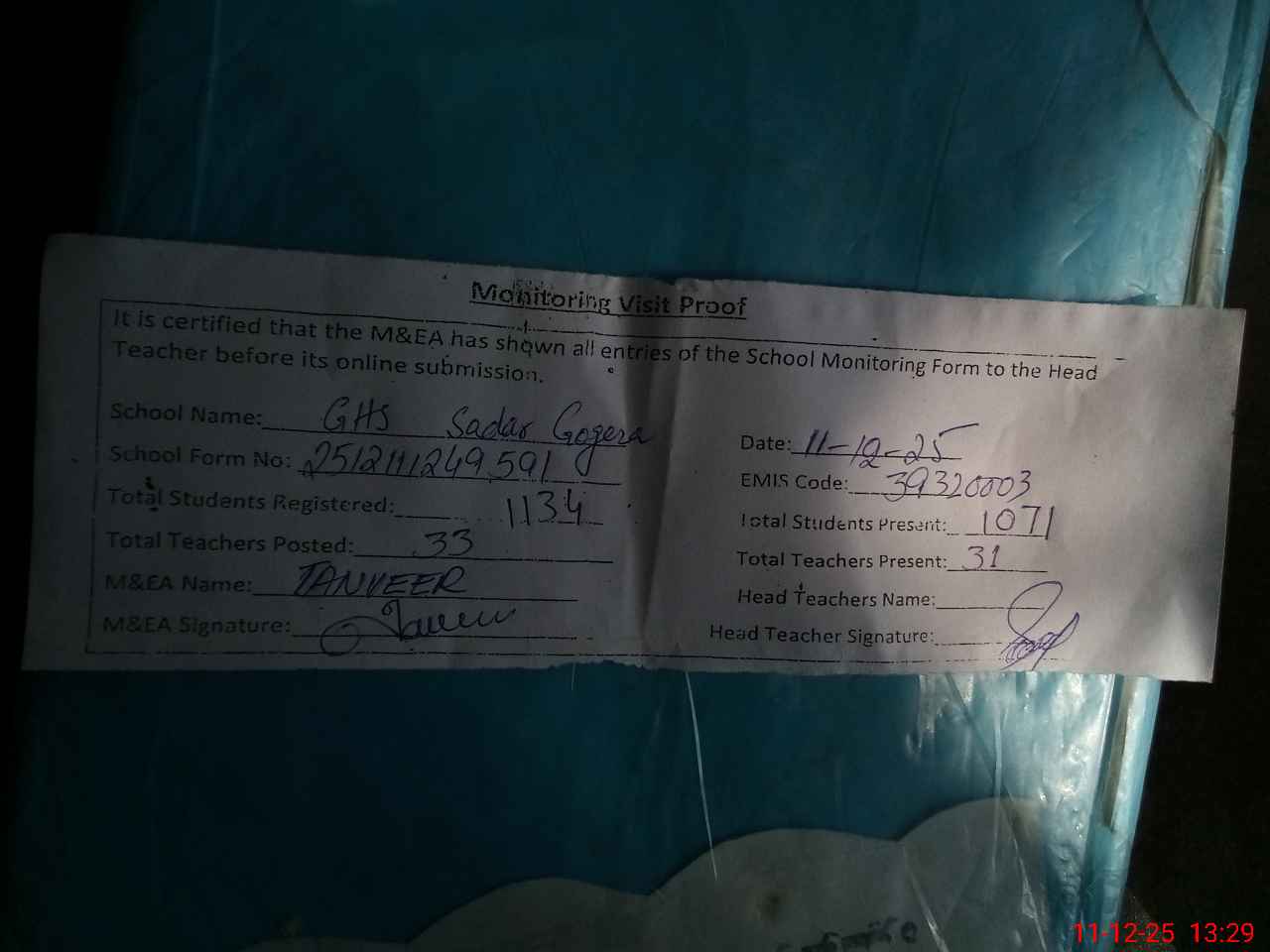 | Attendance Register | Head Teacher | MEA with School | Visit Proof |
