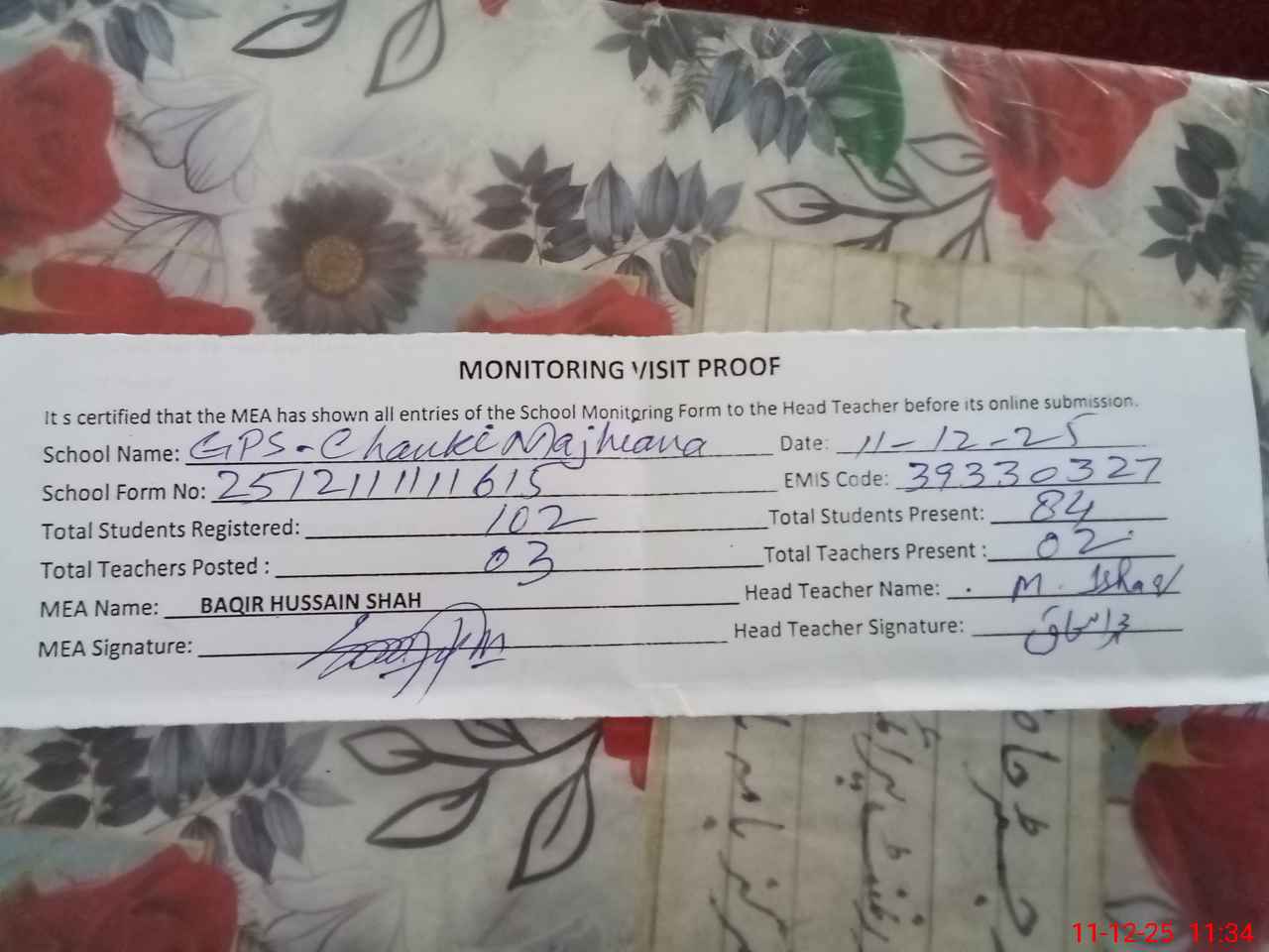 | Attendance Register | Head Teacher | MEA with School | Visit Proof |