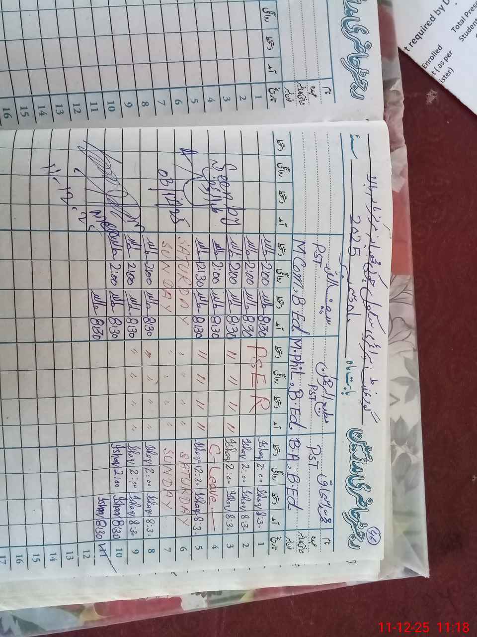 | CNIC | Full Name | Designation | R/C | Absence During Last Calender Month |
