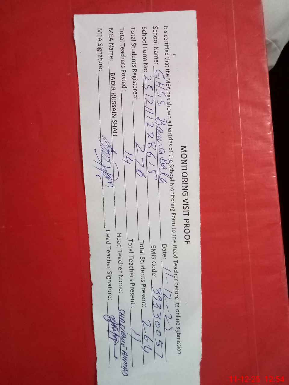 | Attendance Register | Head Teacher | MEA with School | Visit Proof |
