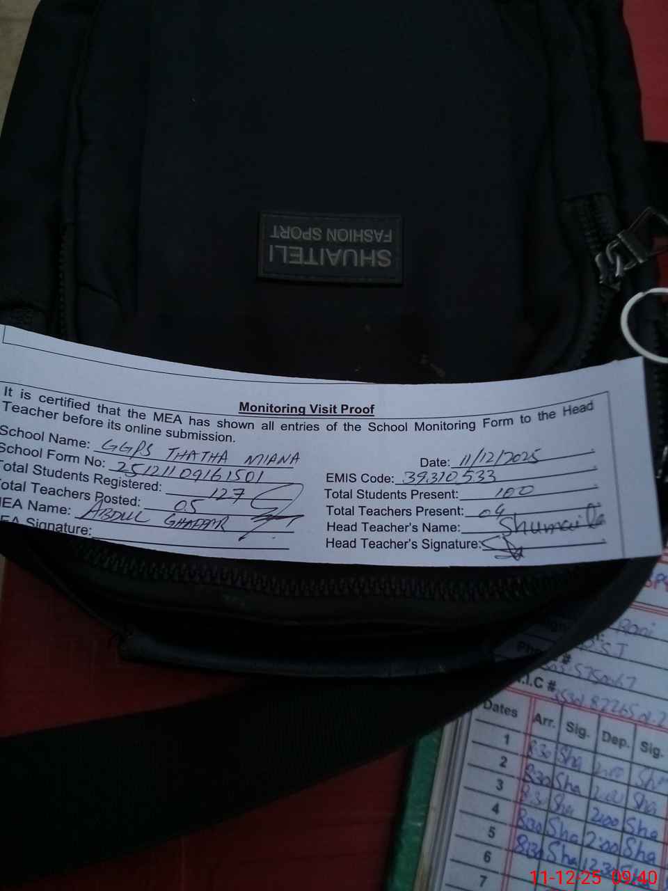 | Attendance Register | Head Teacher | MEA with School | Visit Proof |