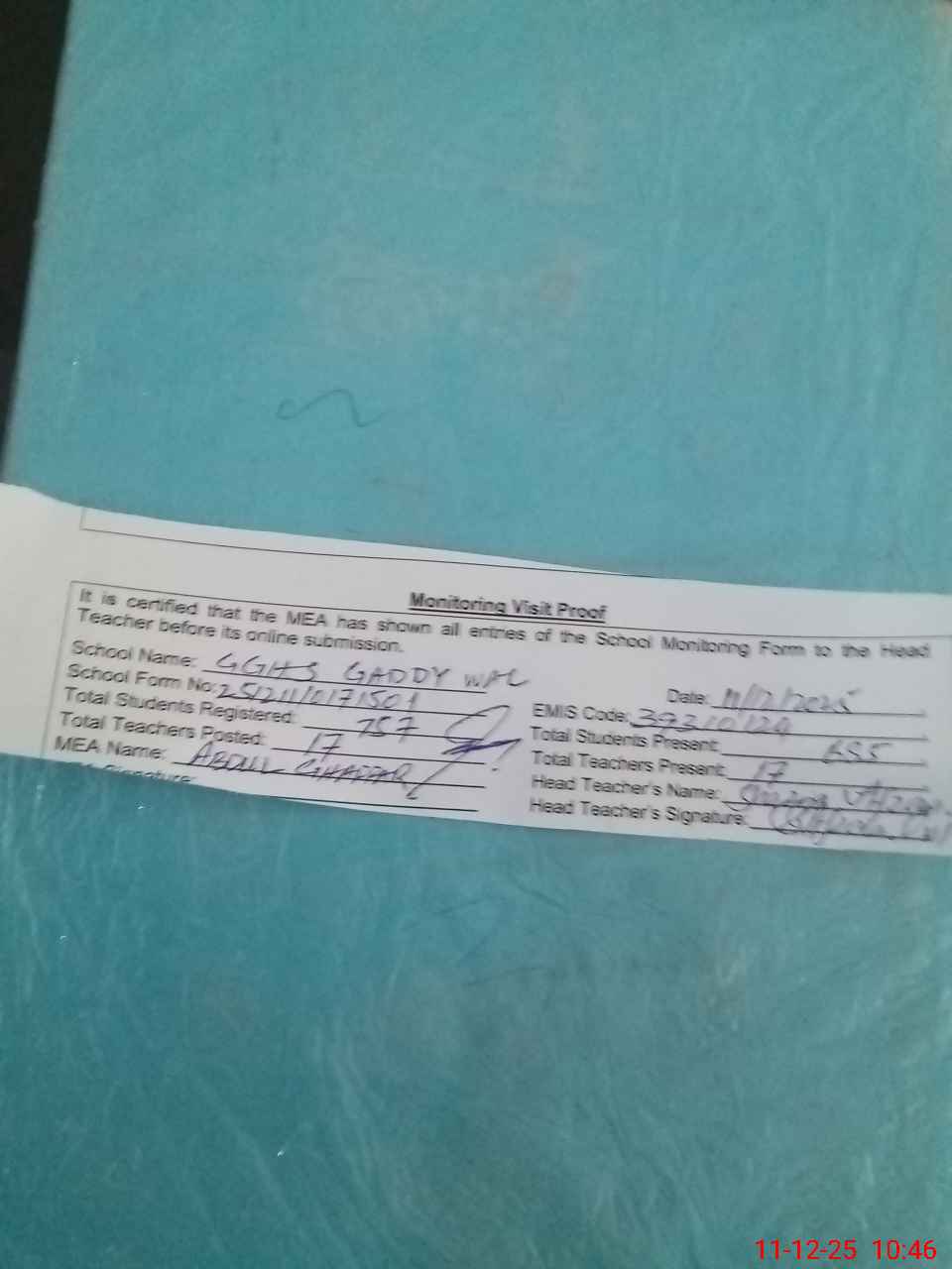 | Attendance Register | Head Teacher | MEA with School | Visit Proof |