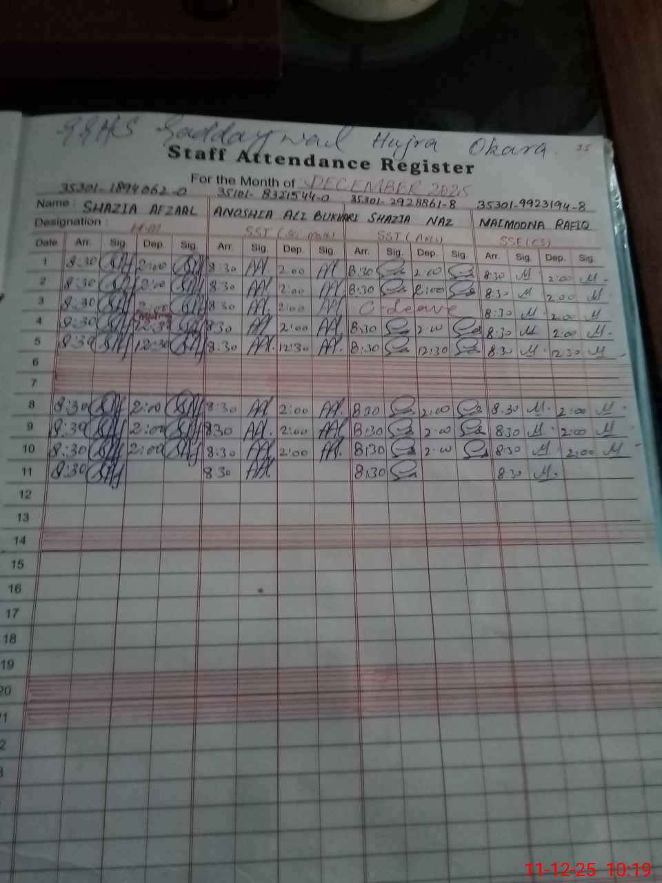 | CNIC | Full Name | Designation | R/C | Absence during last cal. month |