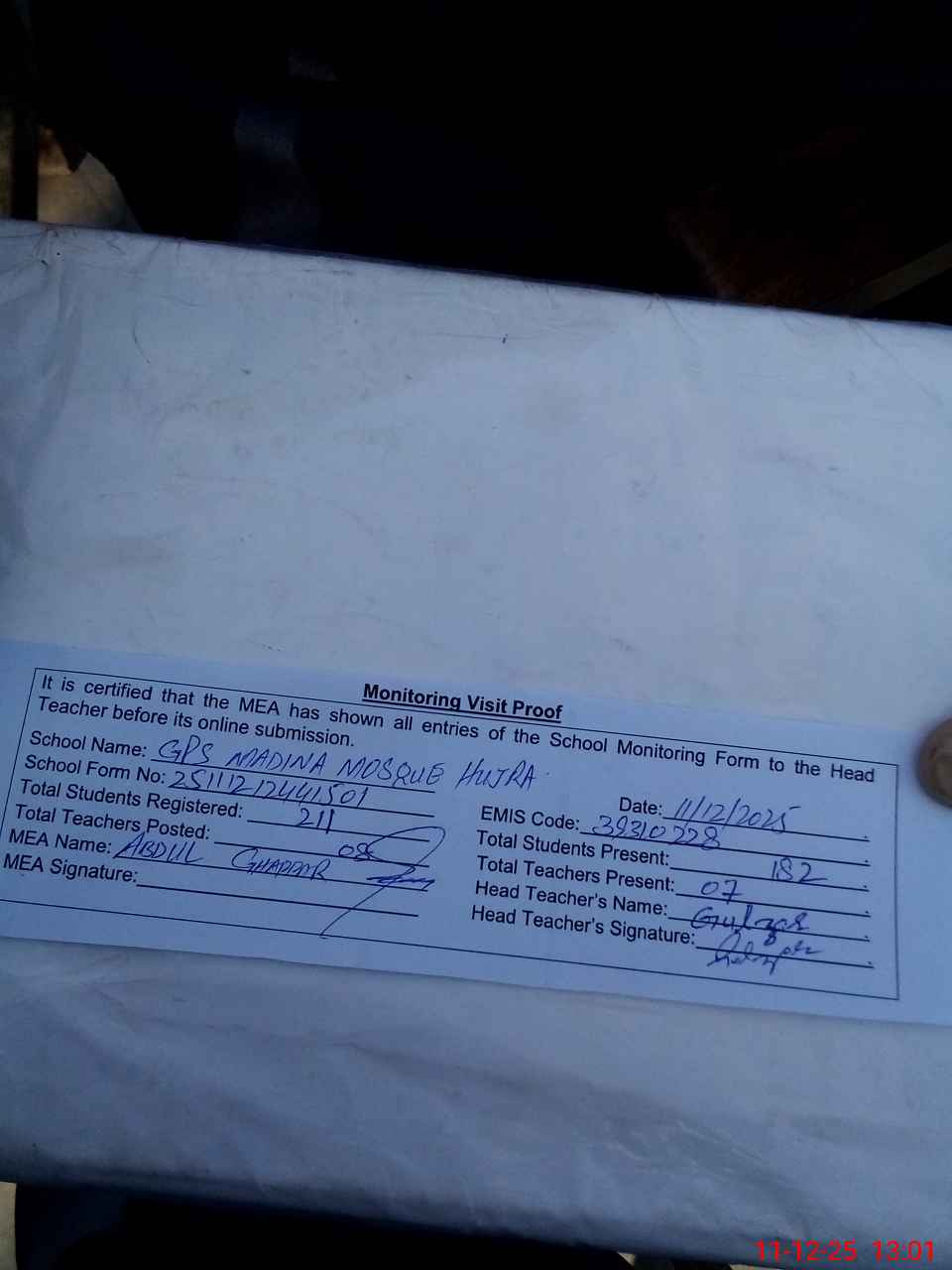 | Attendance Register | Head Teacher | MEA with School | Visit Proof |