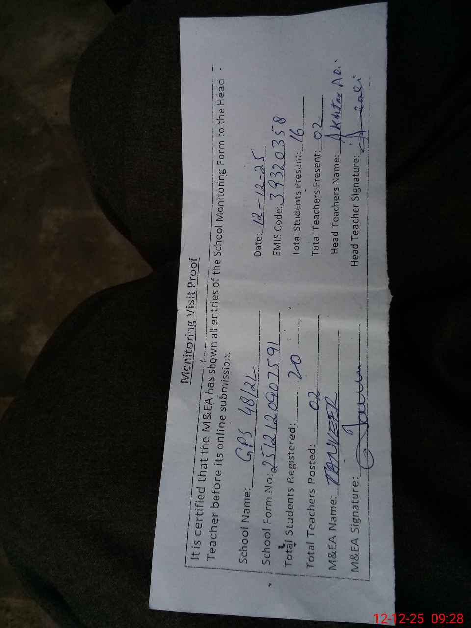 | Attendance Register | Head Teacher | MEA with School | Visit Proof |