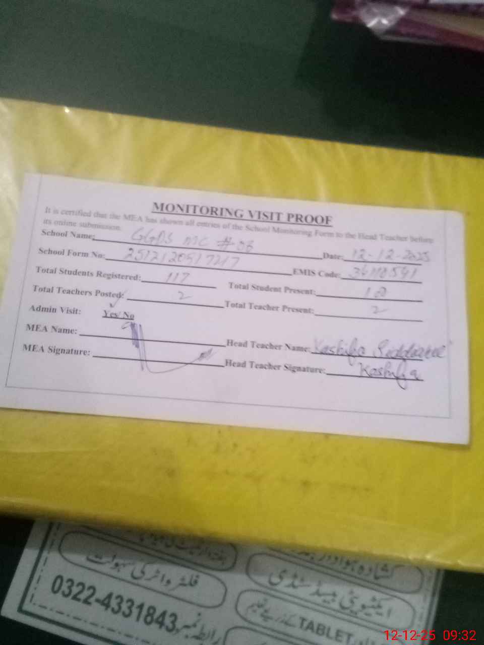 | Attendance Register | Head Teacher | MEA with School | Visit Proof |