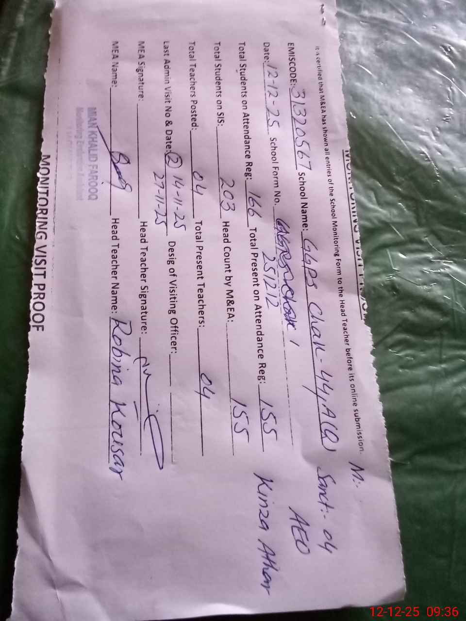 | Monitoring Date: 12-12-2025 | Start Time: 12-12-2025 08:47 AM | End Time: 12-12-2025 09:36 AM | Name of MEA: Kh**** Fa**** | |