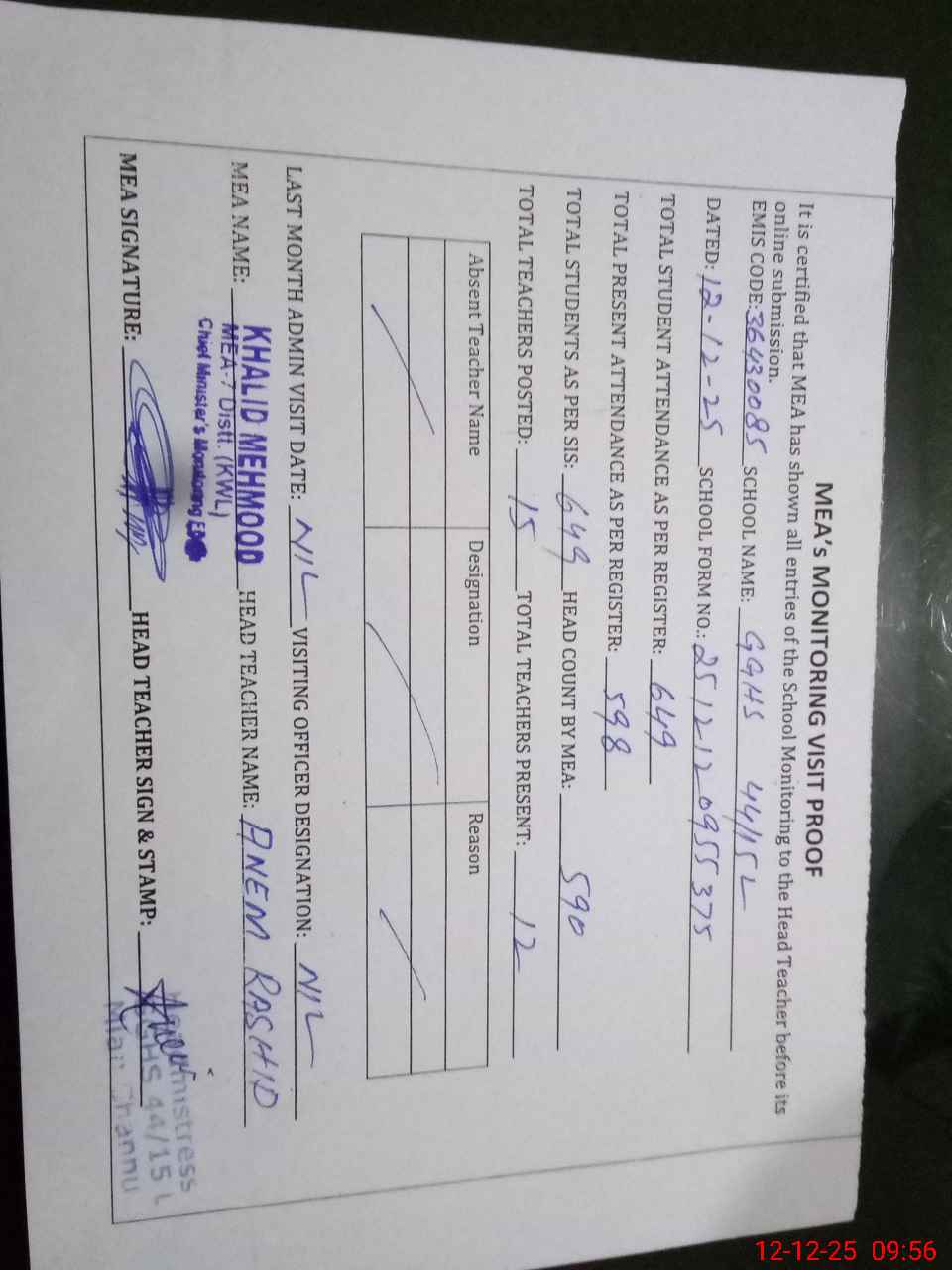 | EMIS Code: 36430085 | Name of School: GGHS 44/15-L, MIAN CHANNU | |||