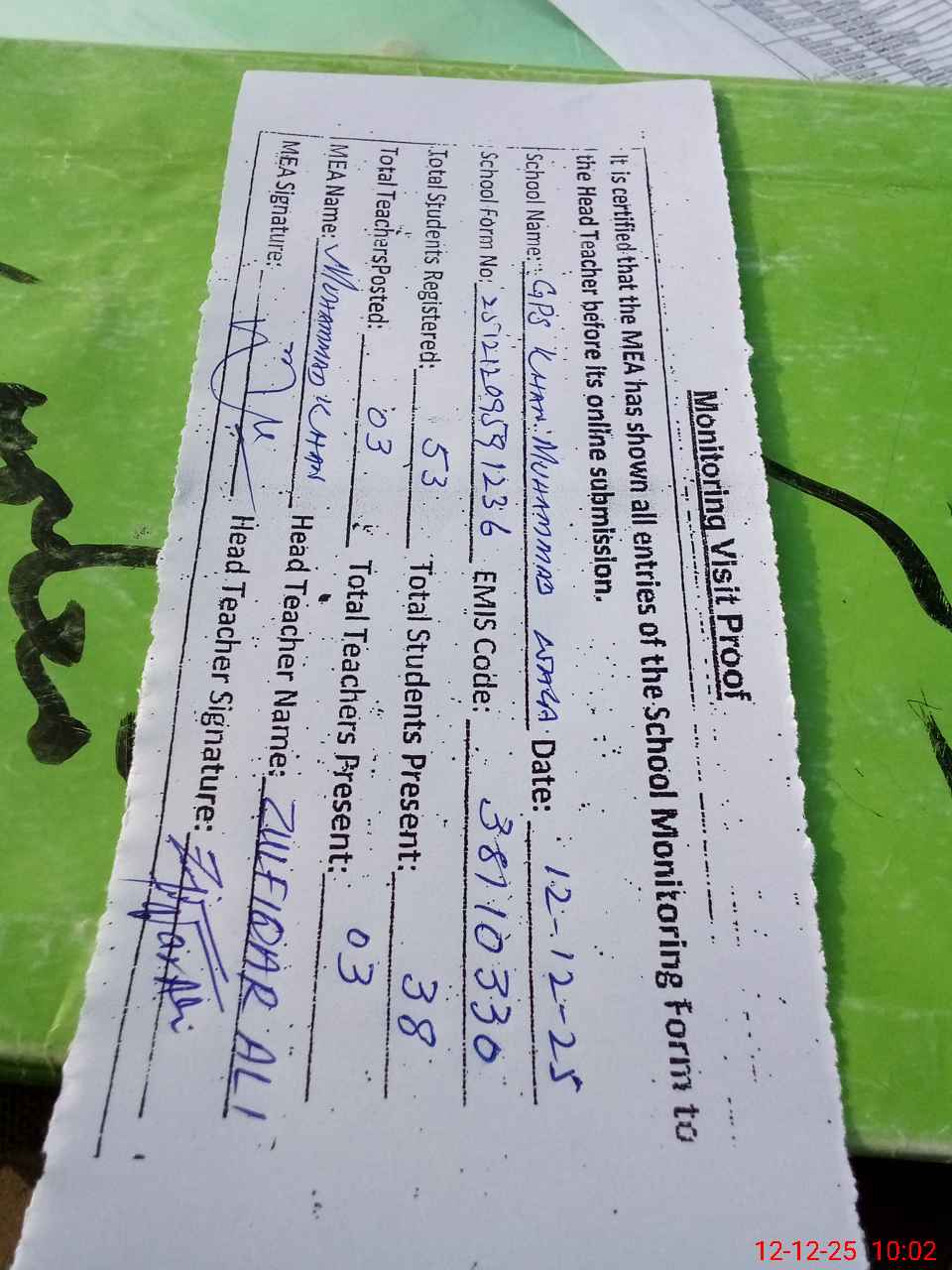 | Attendance Register | Head Teacher | MEA with School | Visit Proof |