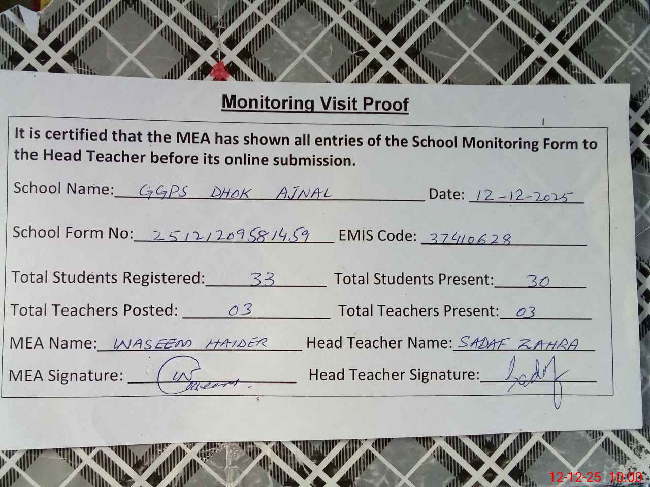 | Attendance Register | Head Teacher | MEA with School | Visit Proof |