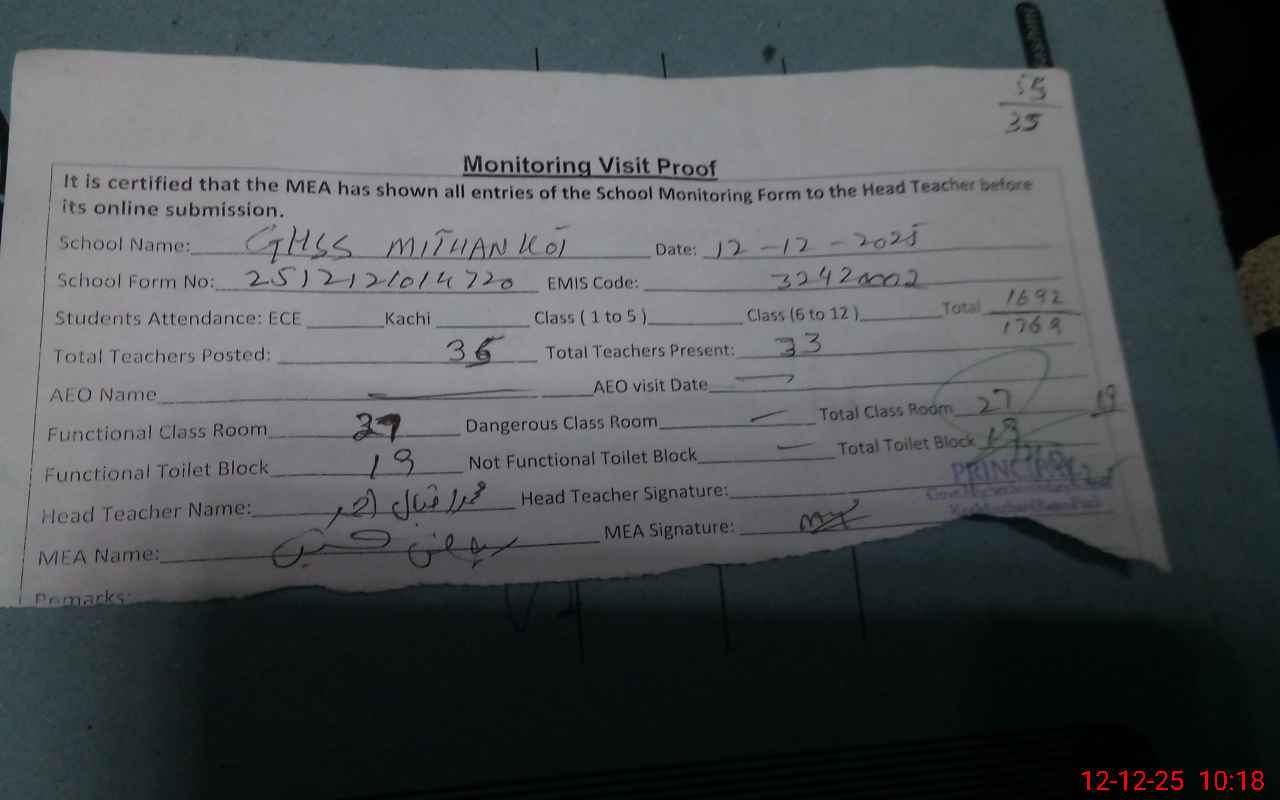 | EMIS Code: 32420002 | Name of School: GHSS MITHAN KOT | |||