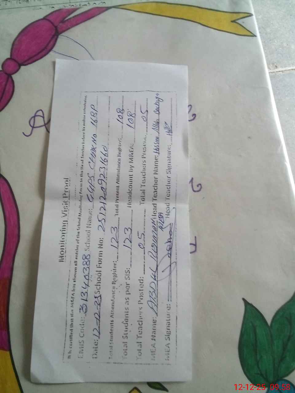 | Attendance Register | Head Teacher | MEA with School | Visit Proof |