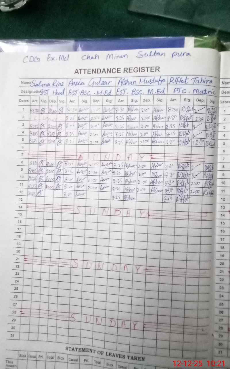 | CNIC | Full Name | Designation | R/C | Absence During Last Calender Month |