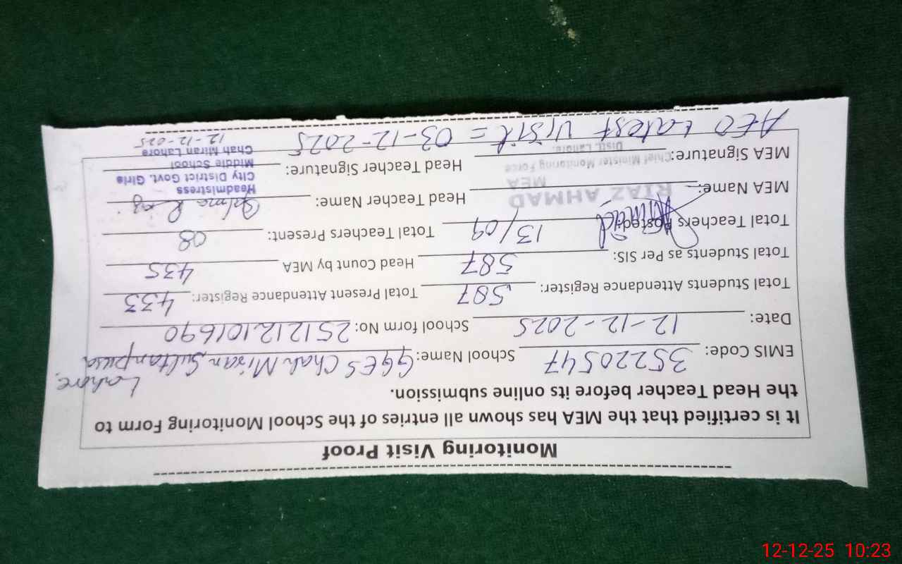 | EMIS Code: 35220547 | Name of School: GGES JUNIOR MODEL CHAH MIRAN SULTAN PURA (EX-MCL) | |||