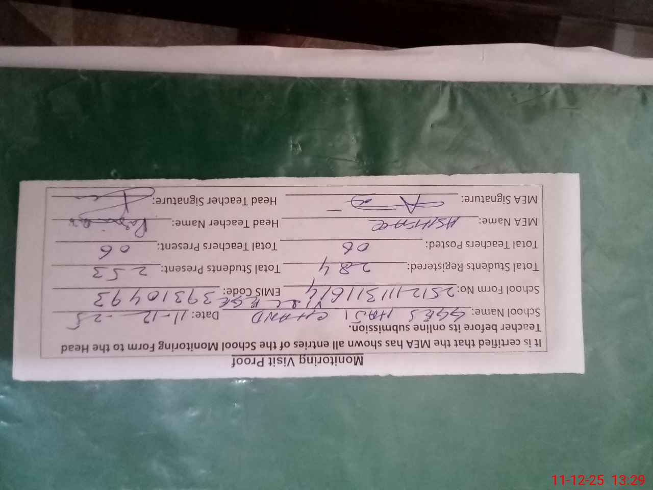 | Attendance Register | Head Teacher | MEA with School | Visit Proof |
