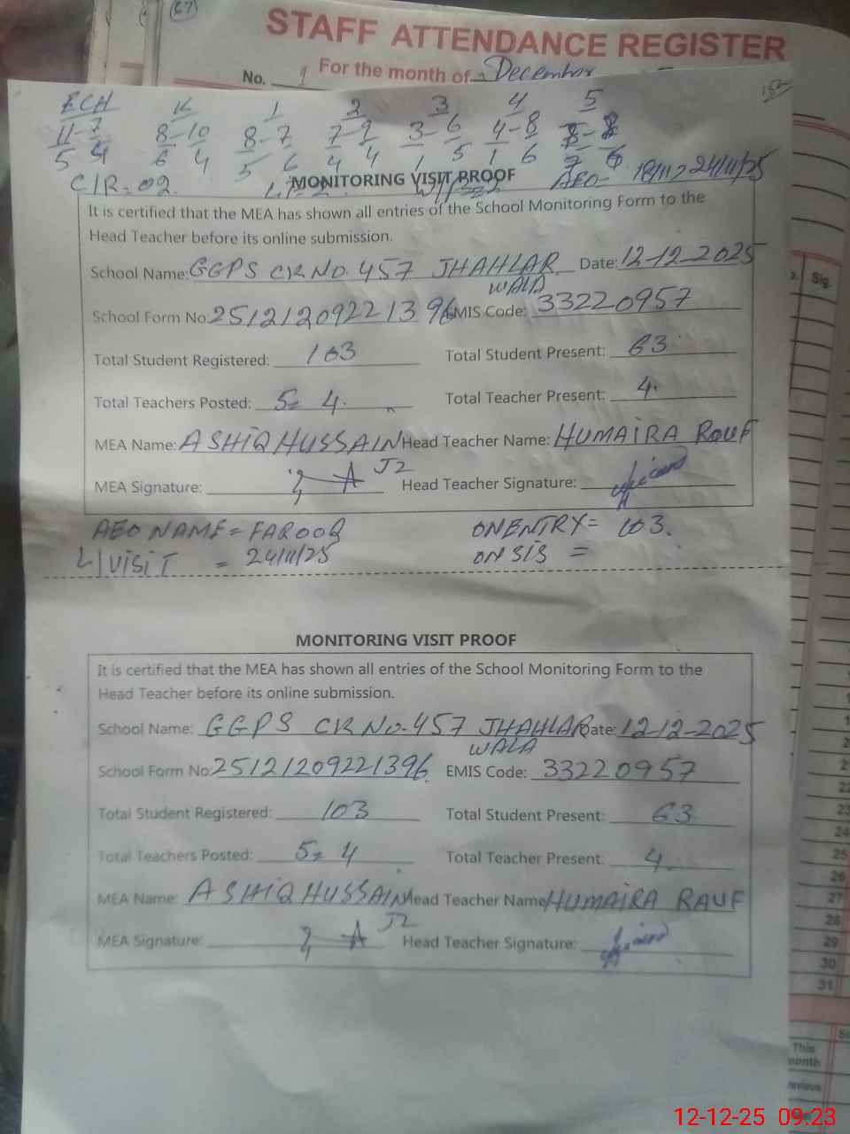 | Attendance Register | Head Teacher | MEA with School | Visit Proof |
