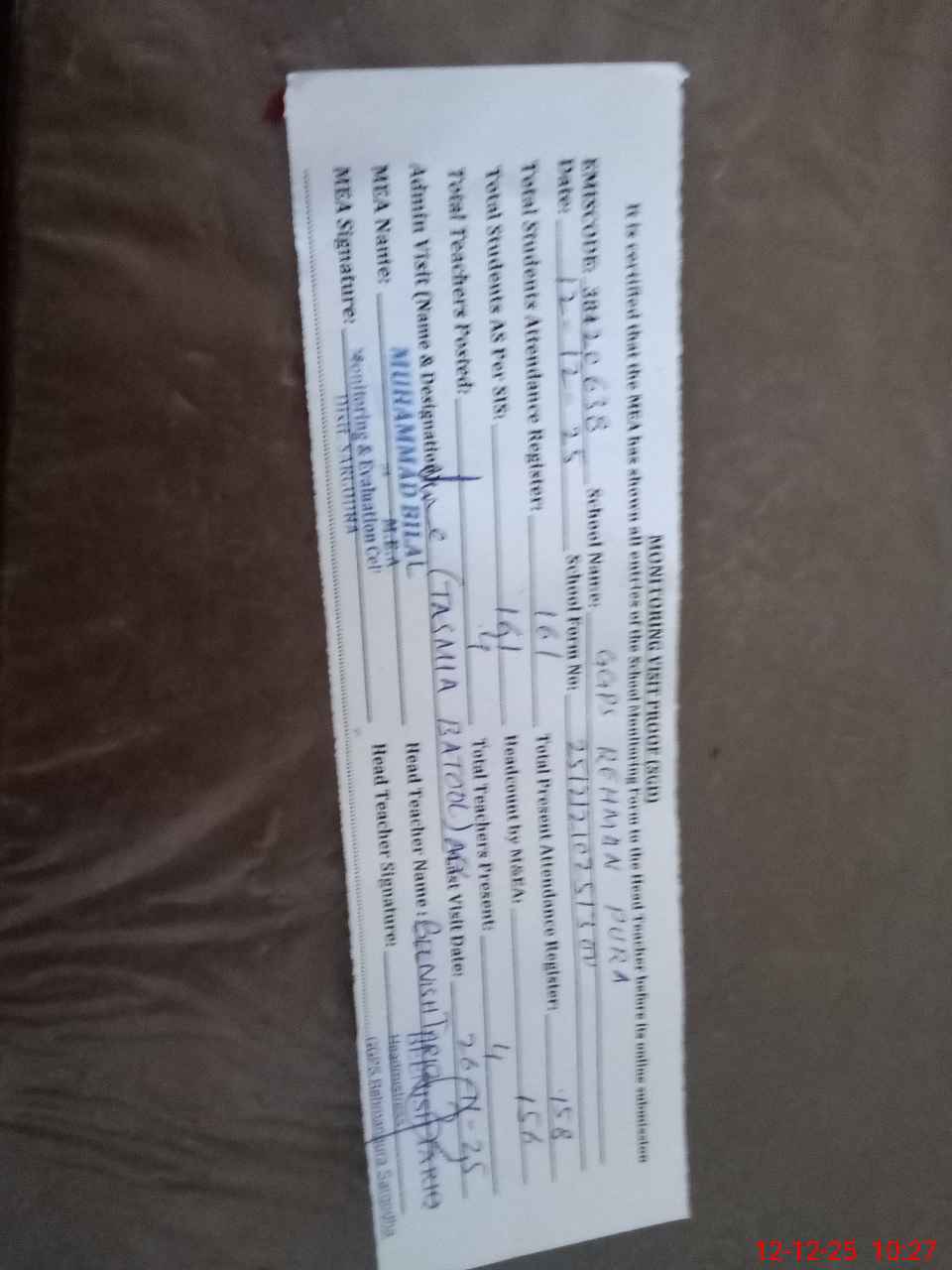 | Attendance Register | Head Teacher | MEA with School | Visit Proof |