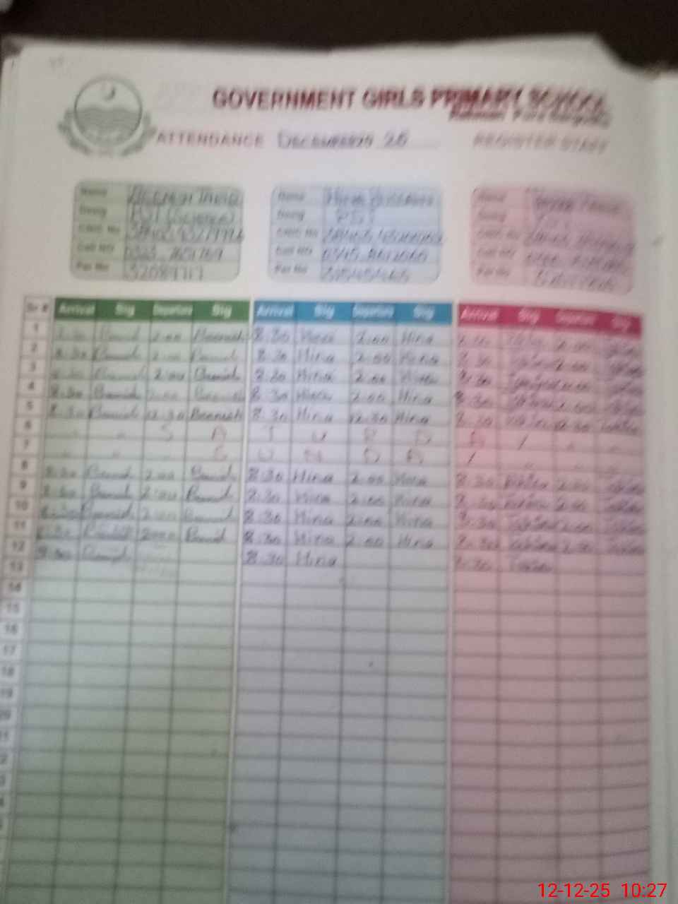 | CNIC | Full Name | Designation | R/C | Absence During Last Calender Month |