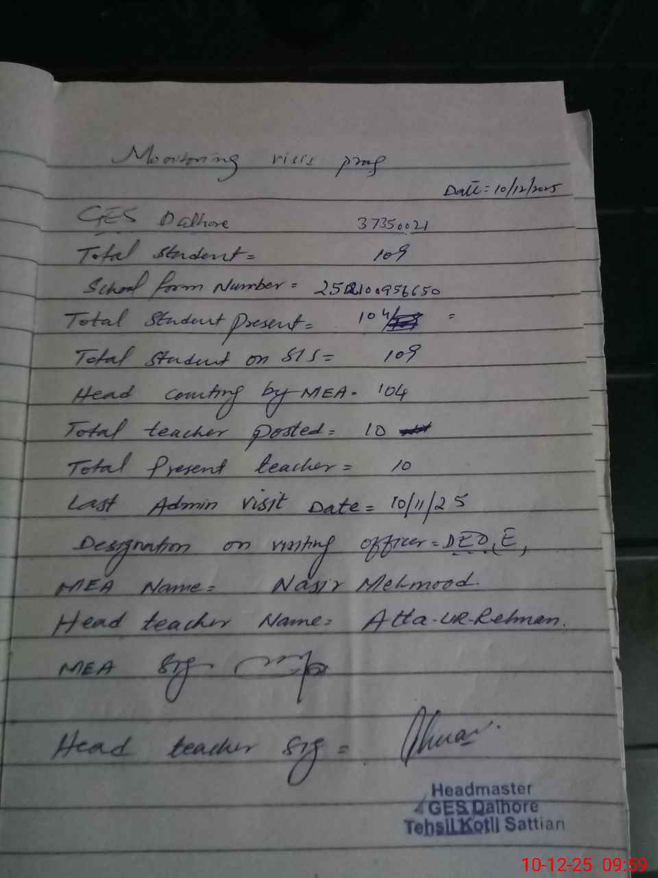 | Attendance Register | Head Teacher | MEA with School | Visit Proof |