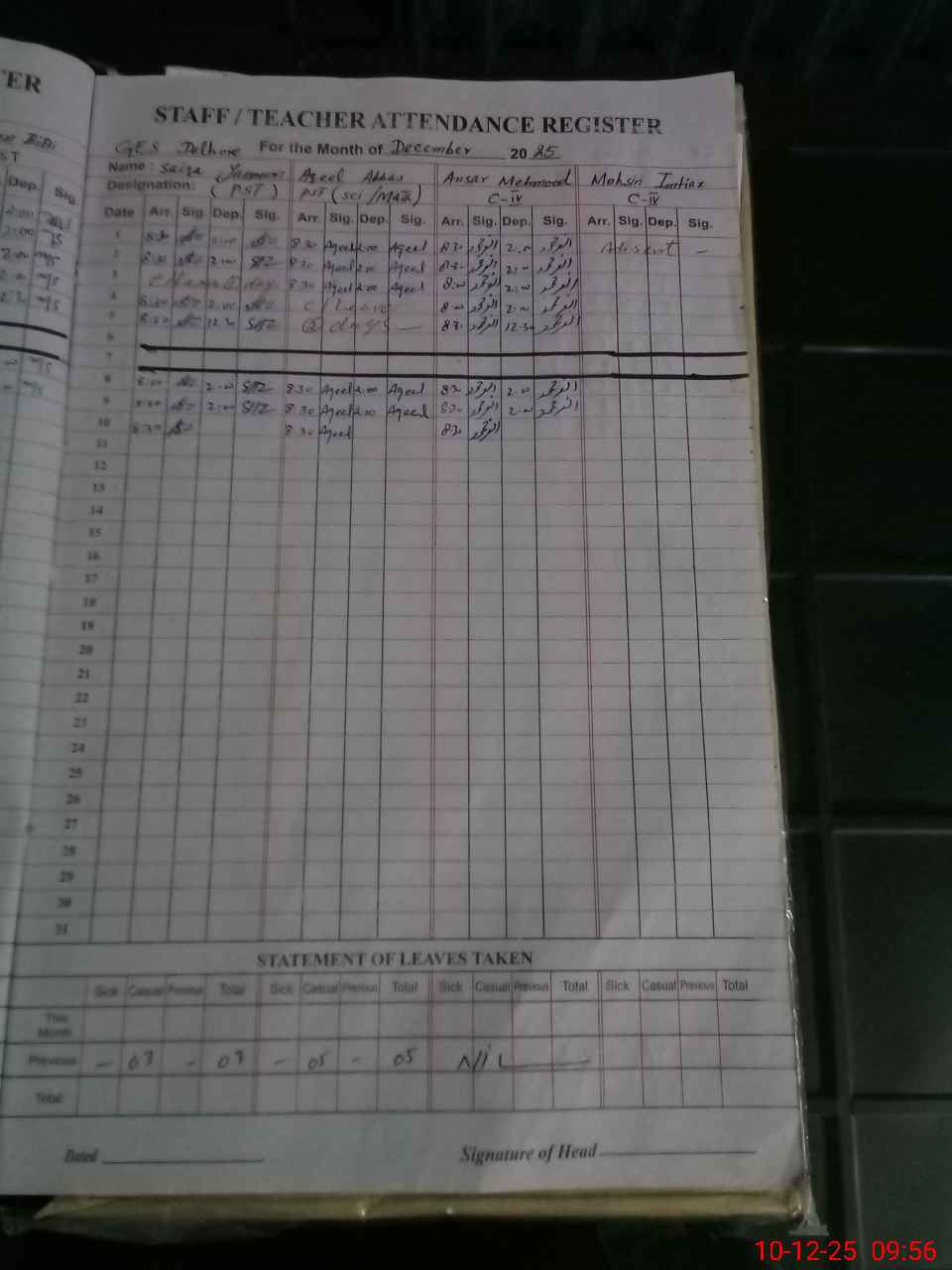 | CNIC | Full Name | Designation | R/C | Absence During Last Calender Month |