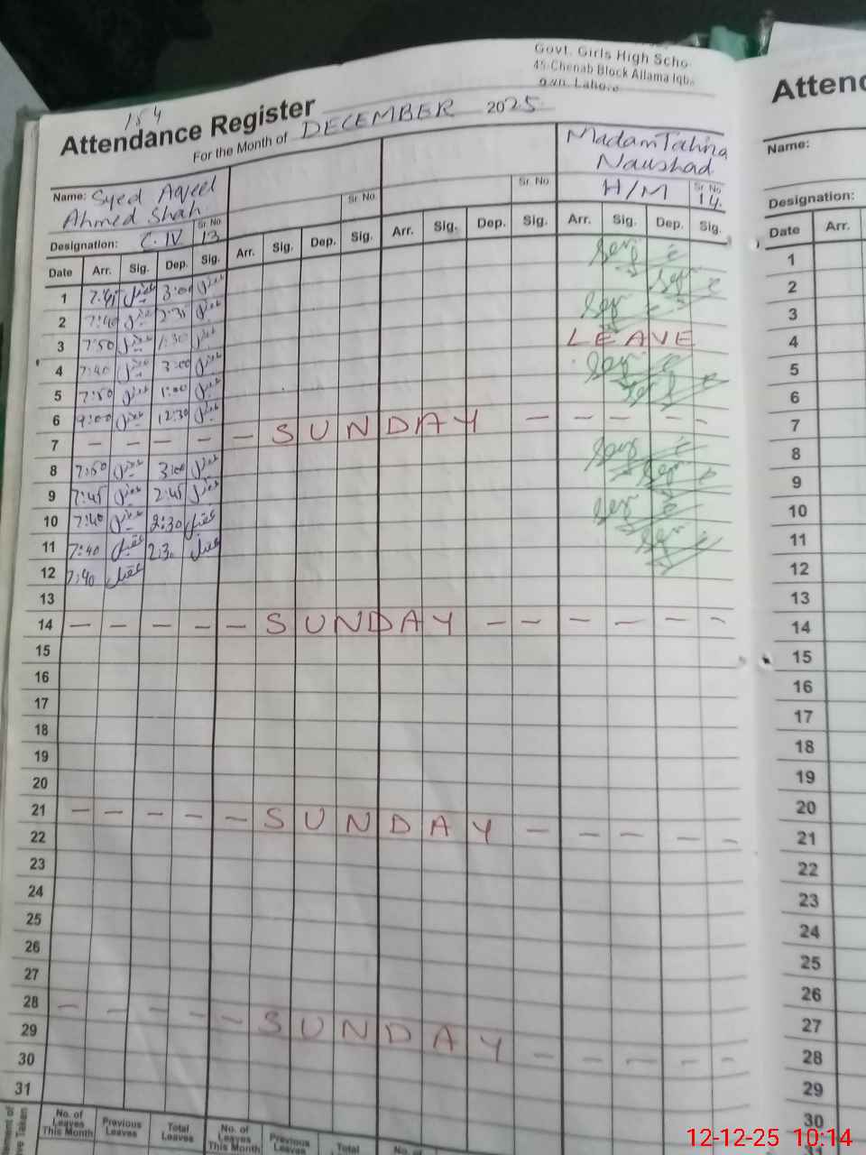 | CNIC | Full Name | Designation | R/C | Absence During Last Calender Month |