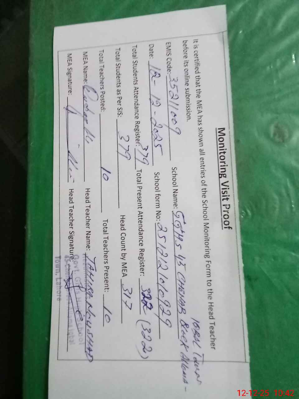 | Attendance Register | Head Teacher | MEA with School | Visit Proof |
