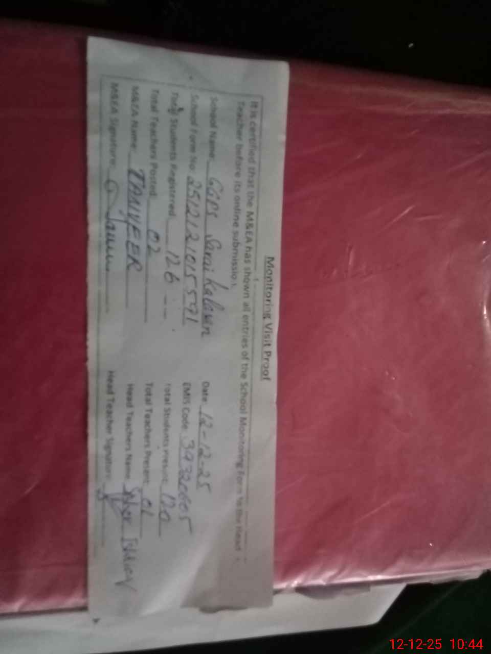 | Attendance Register | Head Teacher | MEA with School | Visit Proof |