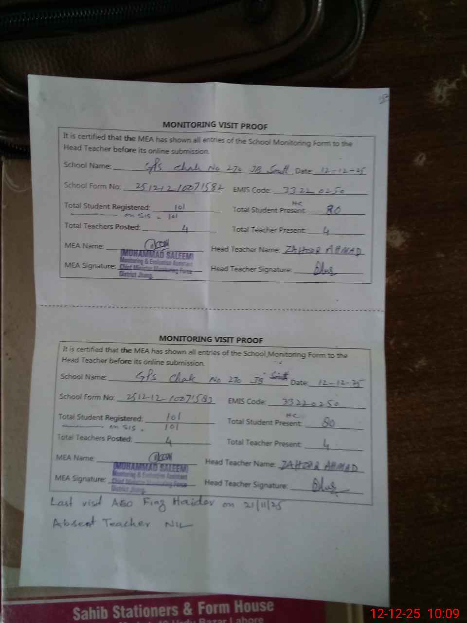 | Attendance Register | Head Teacher | MEA with School | Visit Proof |