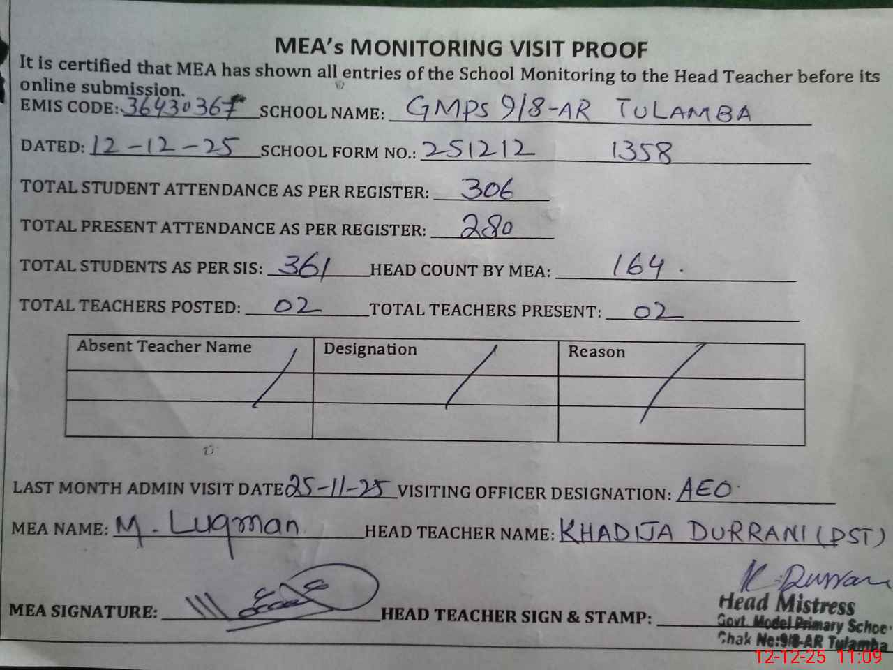 | Attendance Register | Head Teacher | MEA with School | Visit Proof |
