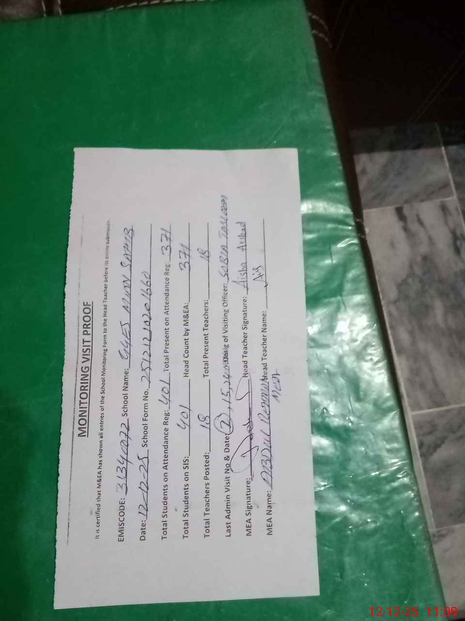 | Attendance Register | Head Teacher | MEA with School | Visit Proof |