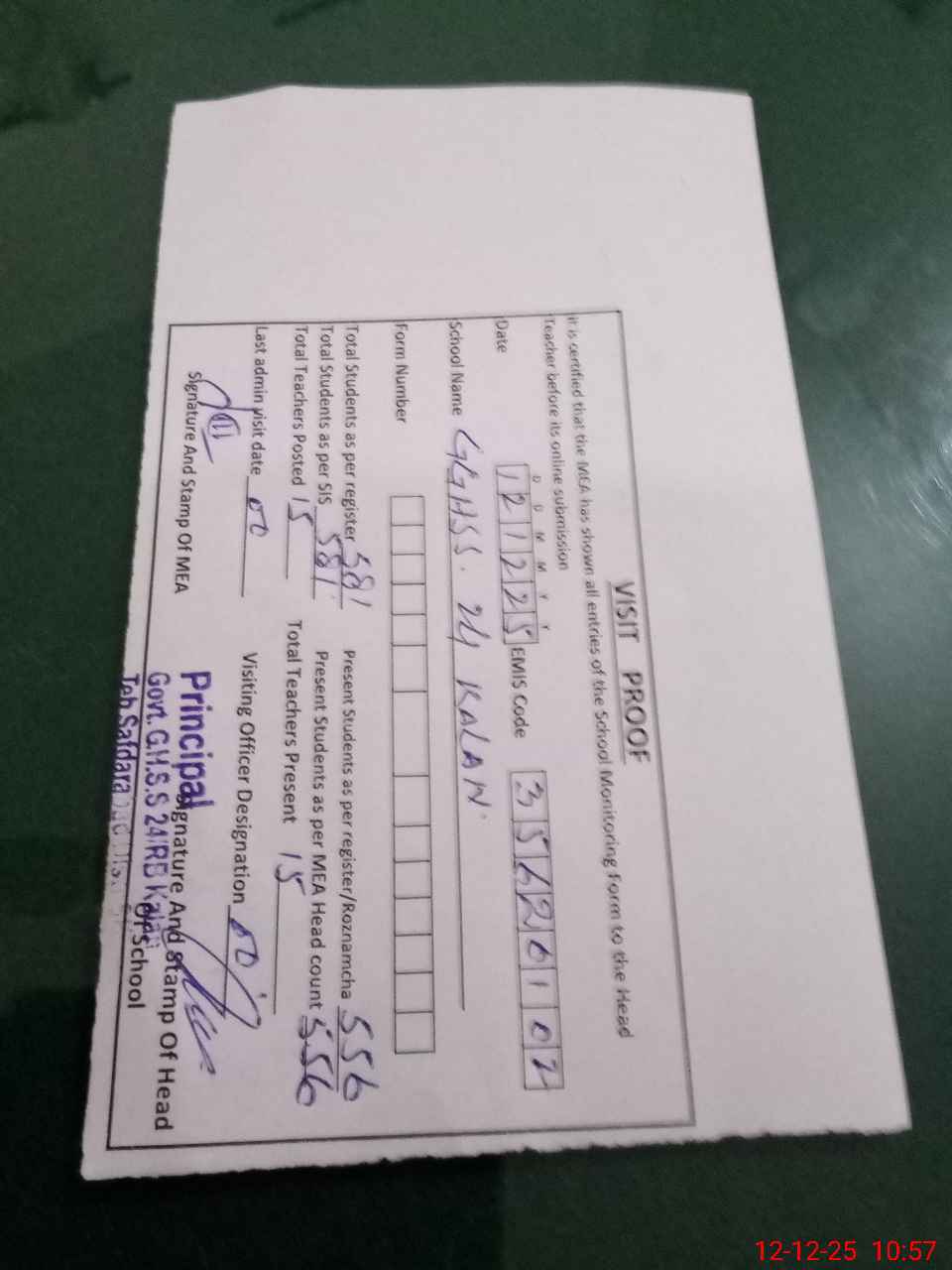 | Attendance Register | Head Teacher | MEA with School | Visit Proof |