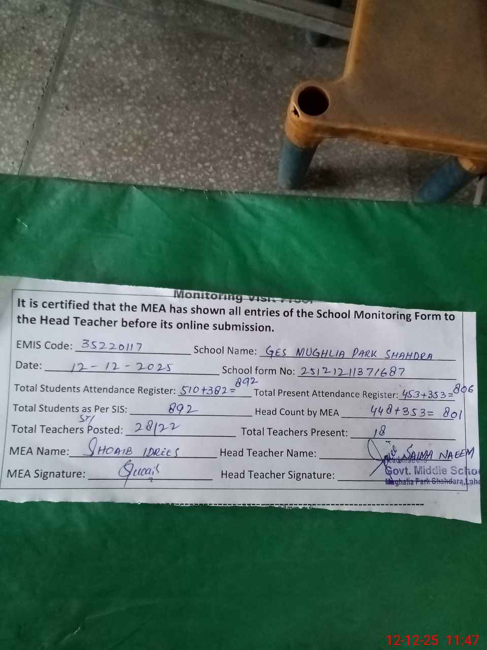 | EMIS Code: 35220117 | Name of School: GES MUGHLIA PARK SHAHDARA LAHORE | |||