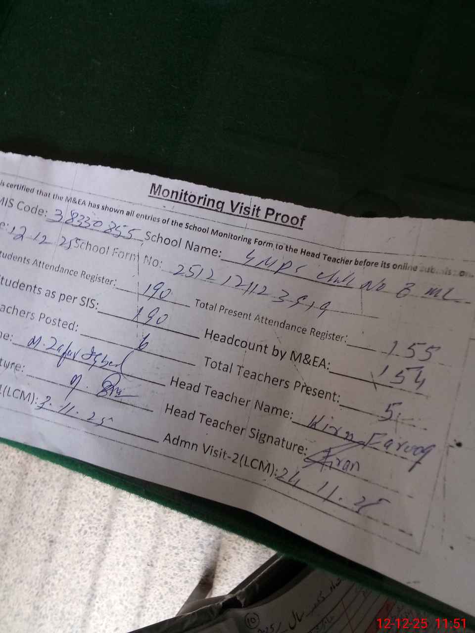 | Attendance Register | Head Teacher | MEA with School | Visit Proof |
