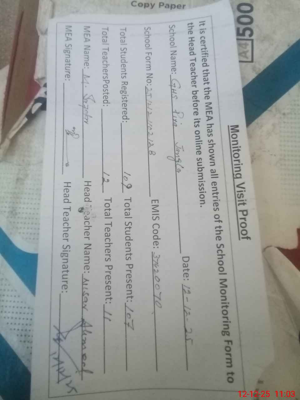| Attendance Register | Head Teacher | MEA with School | Visit Proof |