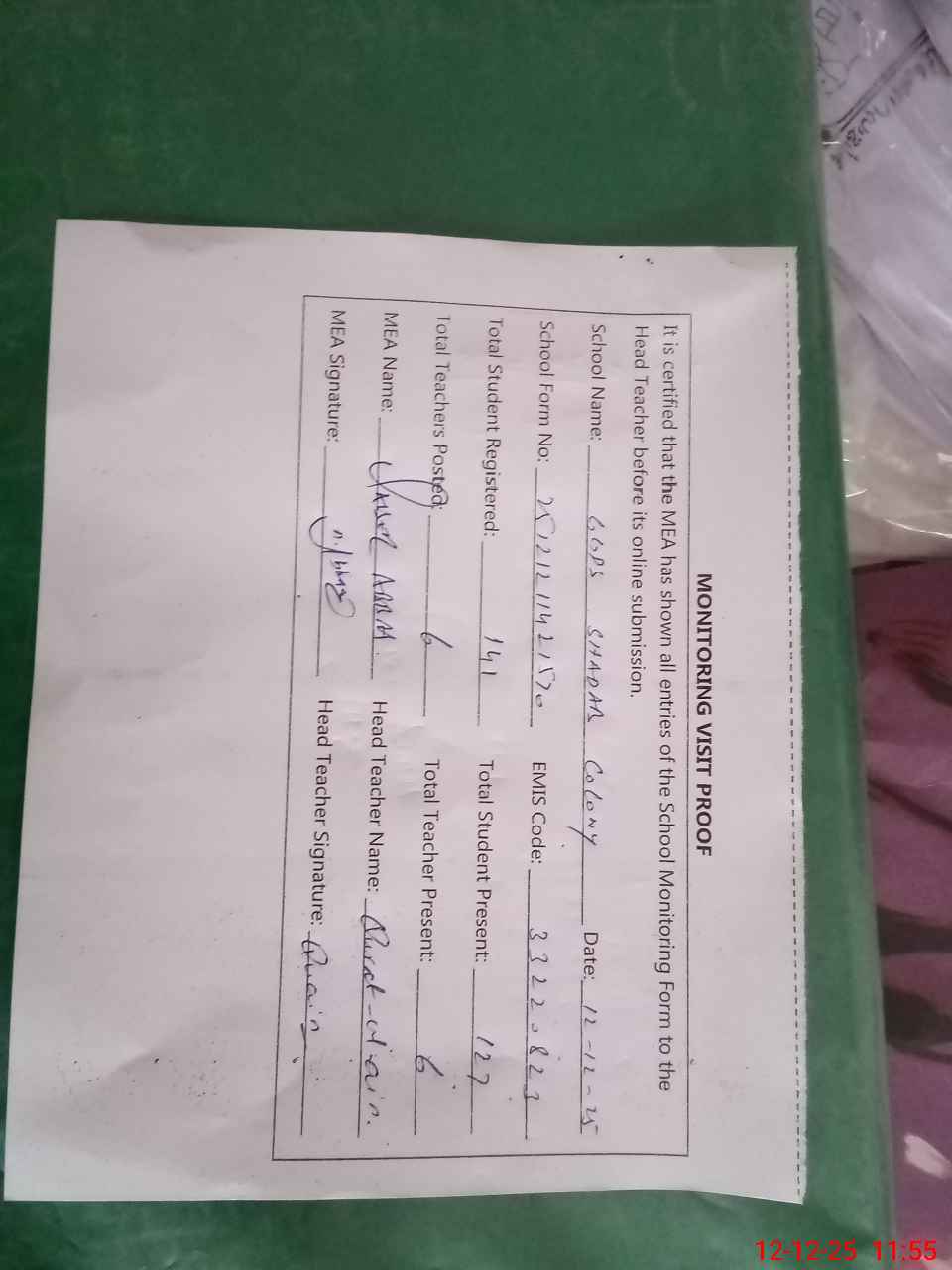 | EMIS Code: 33220823 | Name of School: GGPS SHADAB COLONY | |||