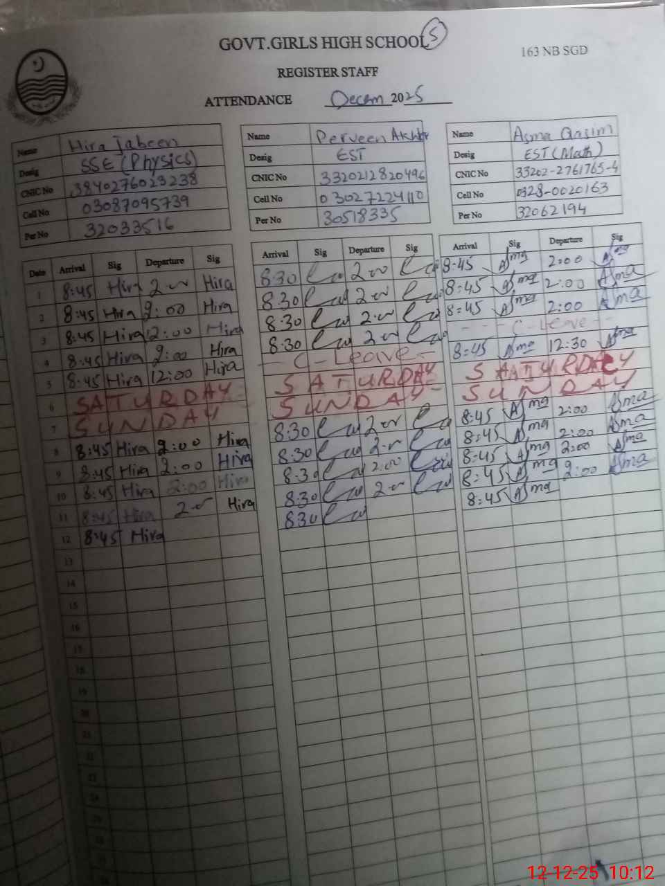| CNIC | Full Name | Designation | R/C | Absence During Last Calender Month |