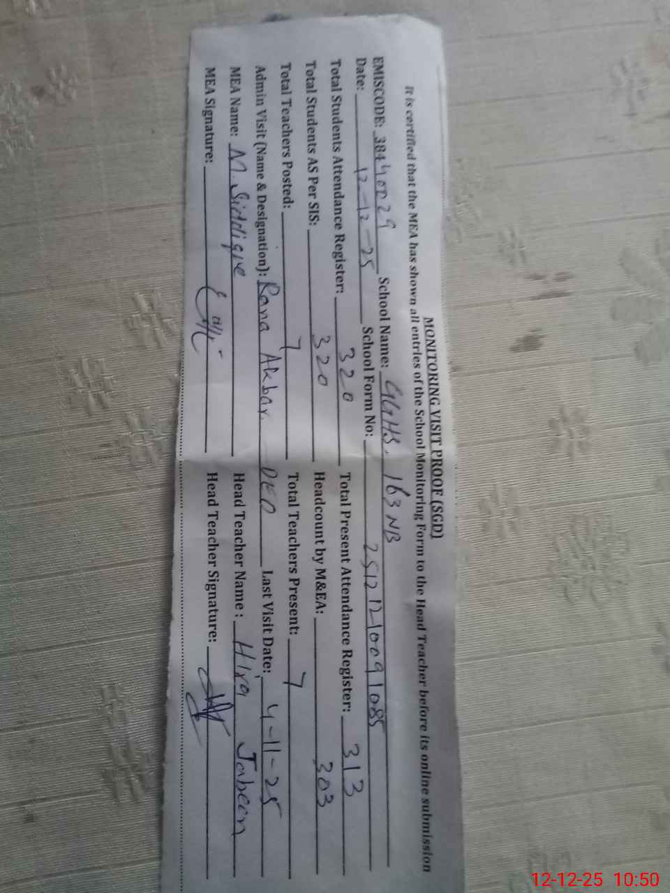 | Attendance Register | Head Teacher | MEA with School | Visit Proof |