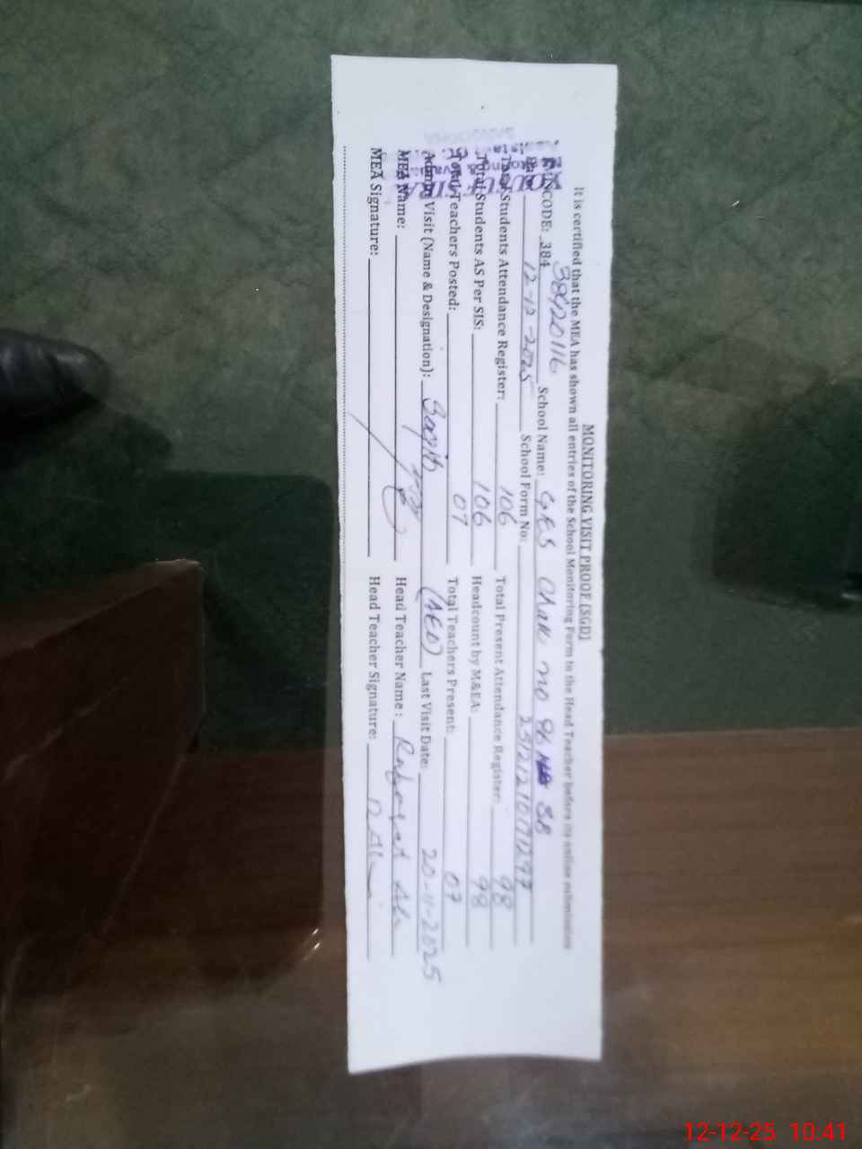 | Attendance Register | Head Teacher | MEA with School | Visit Proof |