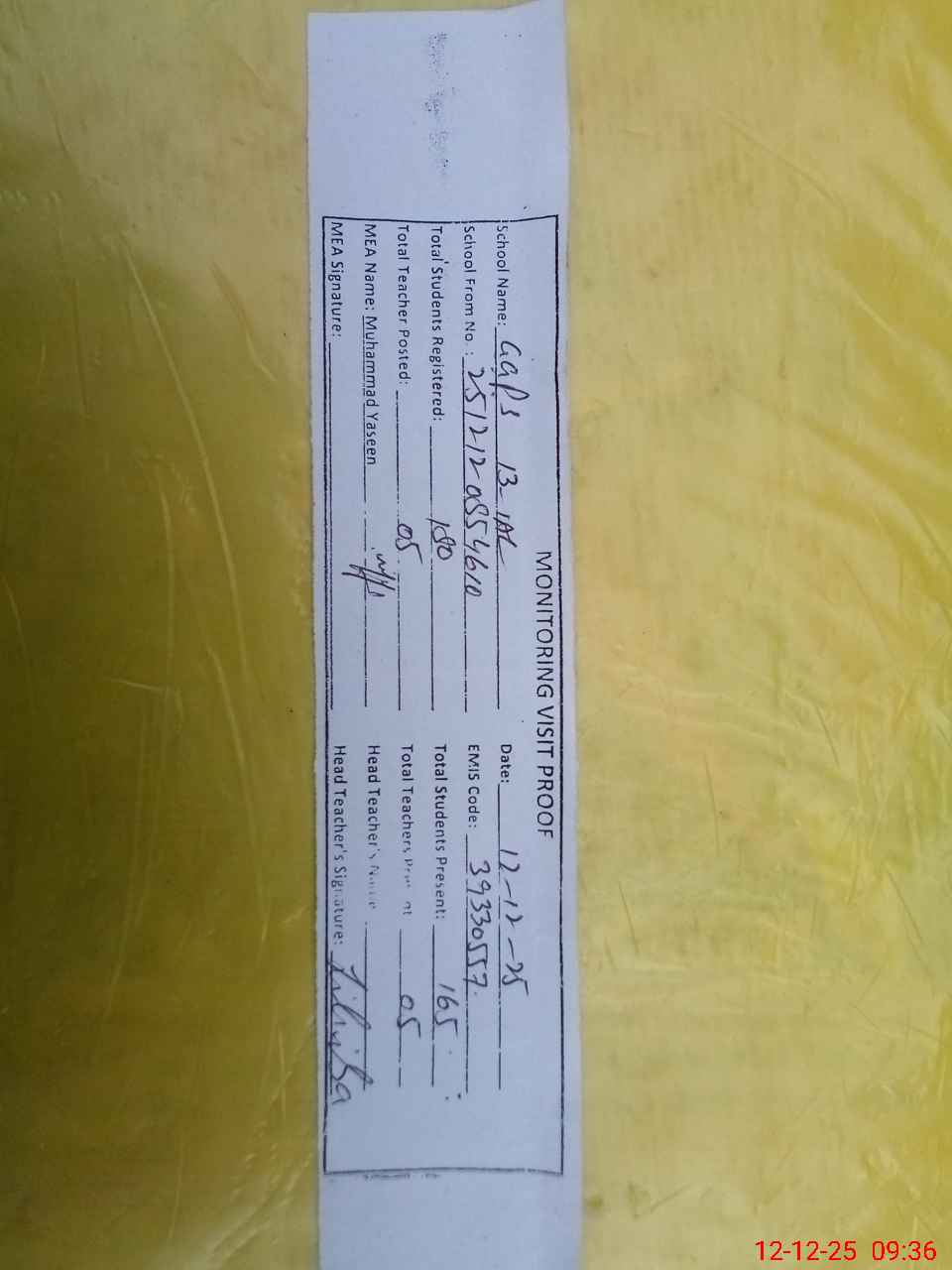 | Attendance Register | Head Teacher | MEA with School | Visit Proof |