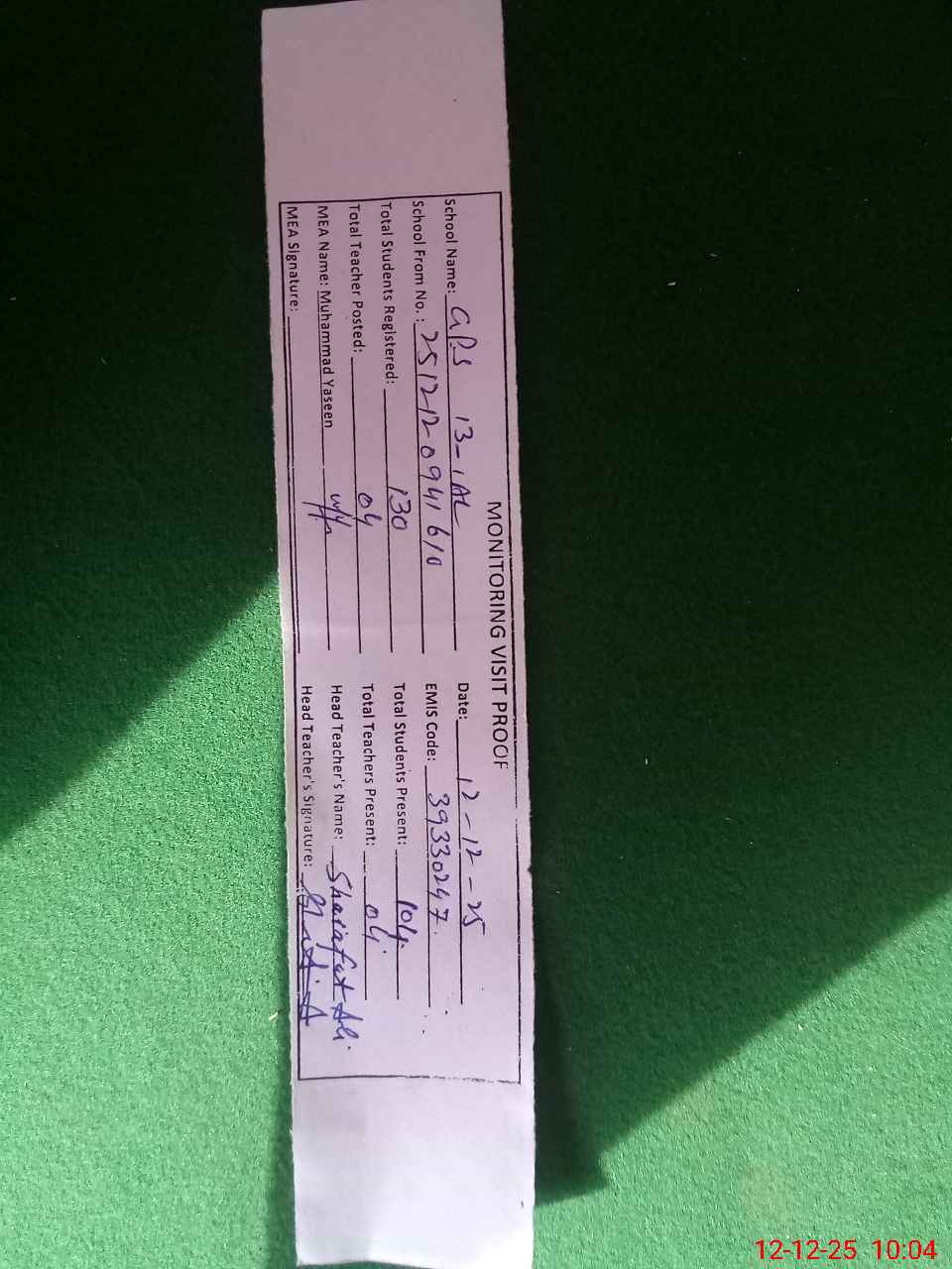 | EMIS Code: 39330247 | Name of School: GPS CHAK NO 13/1.AL | |||