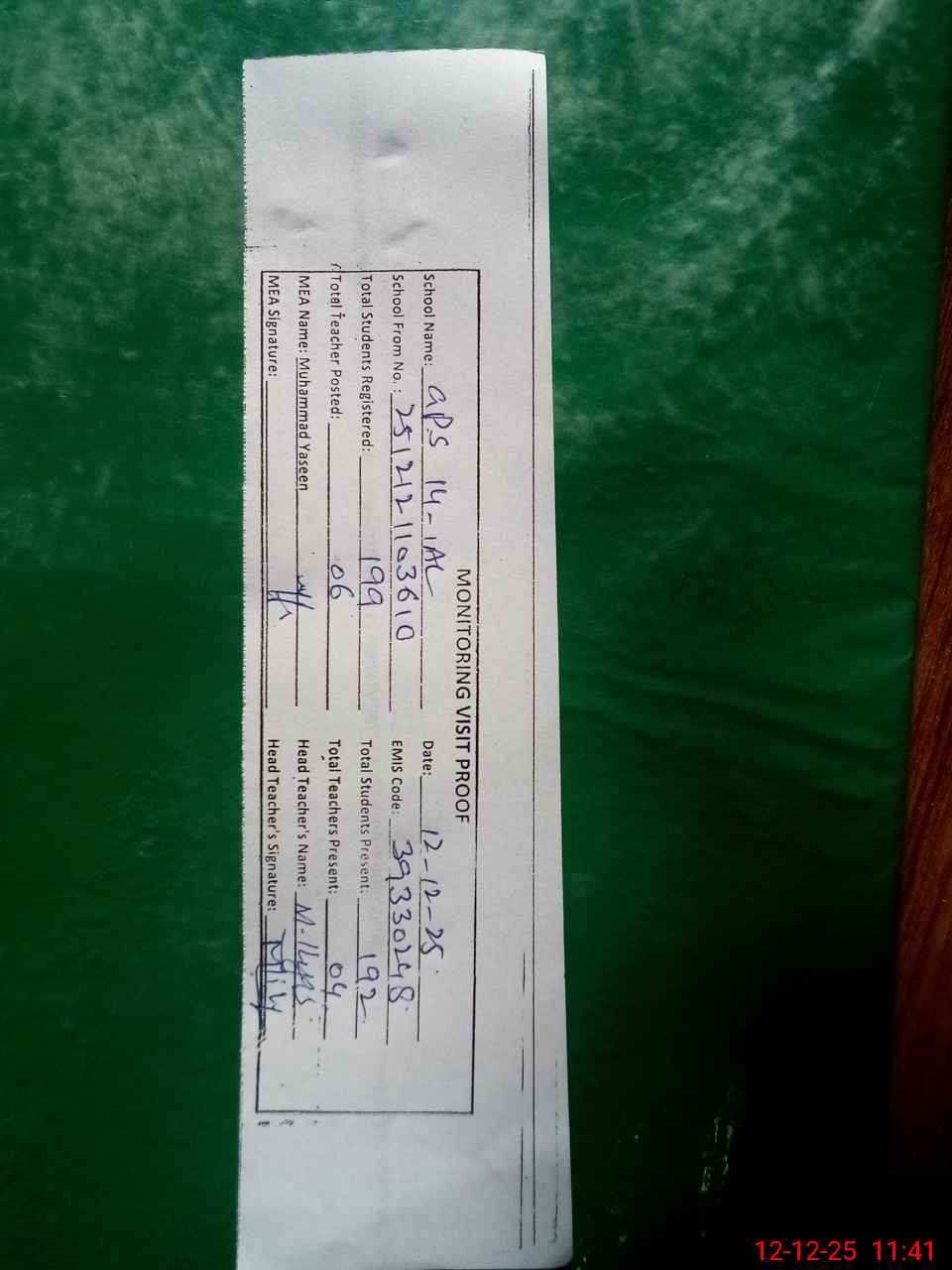 | Attendance Register | Head Teacher | MEA with School | Visit Proof |