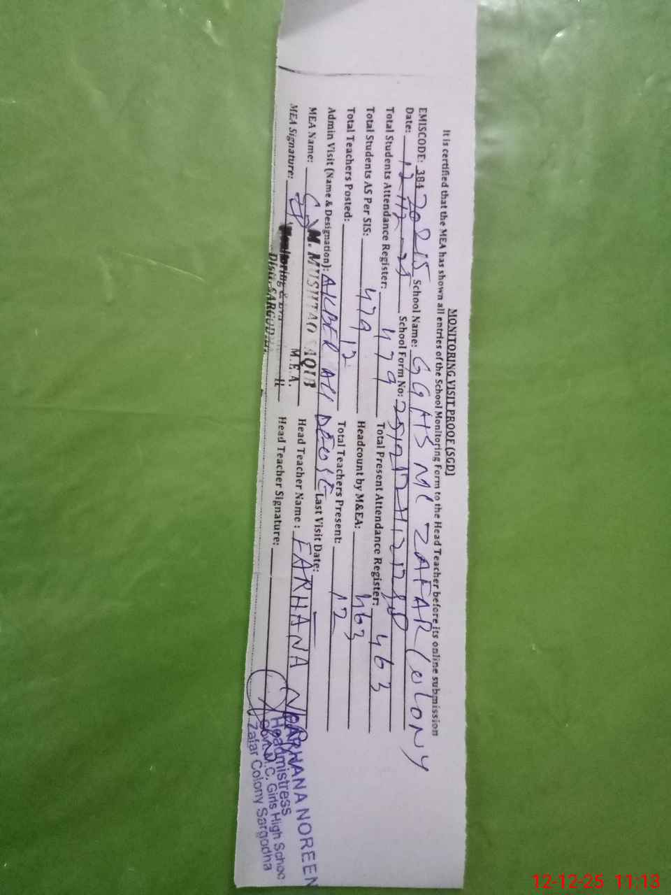 | EMIS Code: 38420215 | Name of School: GGHS MC ZAFAR COLONY SARGODHA | |||