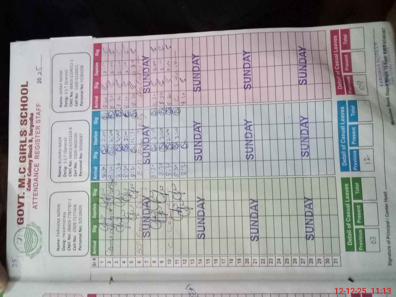 | CNIC | Full Name | Designation | R/C | Absence During Last Calender Month |