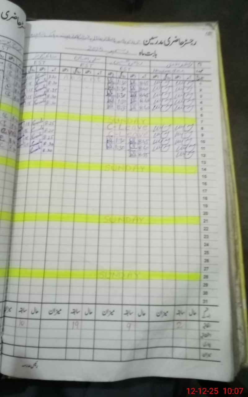 | CNIC | Full Name | Designation | R/C | Absence During Last Calender Month |